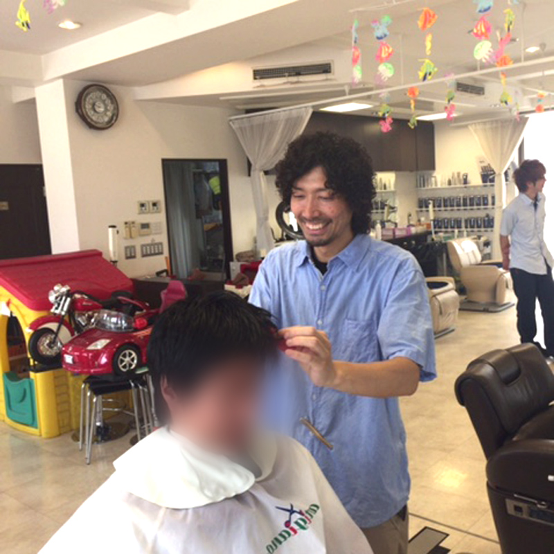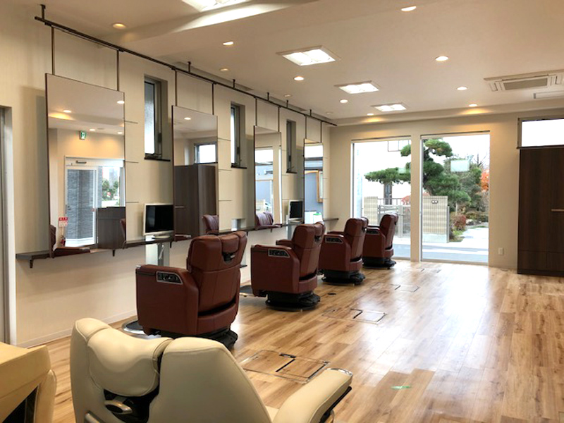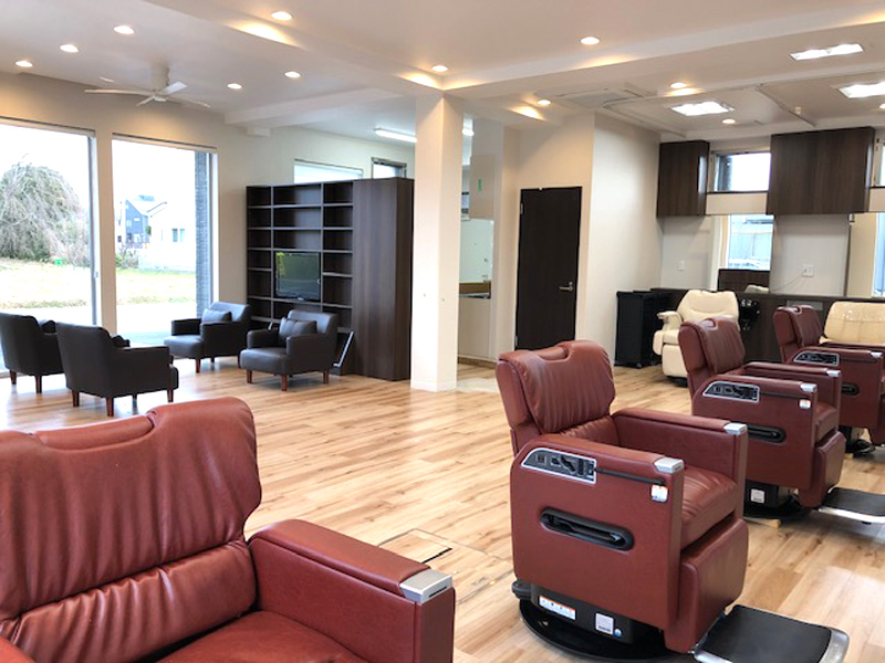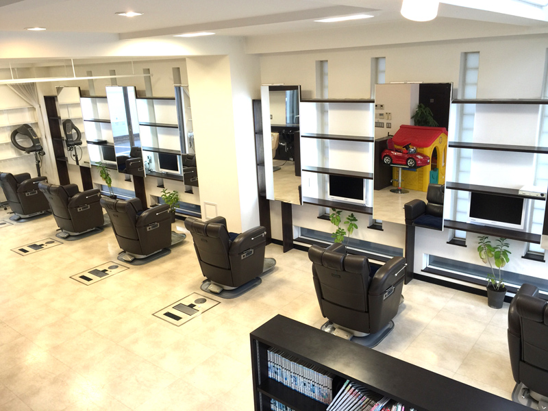 バリアフリー対応のフラットできれいな店内。車椅子に乗ったままほとんどの技術が受けられます。お子様用のかわいいチェアもご用意しておりますので、幅広い年代の方にご安心してご利用いただいております!