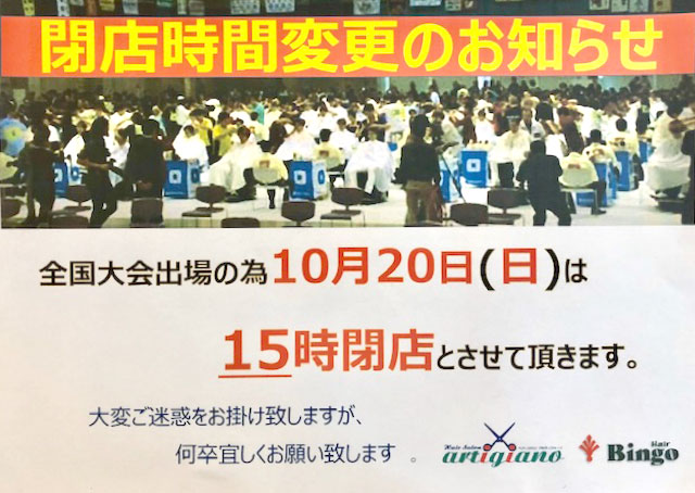 10月19日に開催される全国大会がコロナ拡大の為中止になりましたので、18日も通常通り営業致しますので宜しくお願い致します。